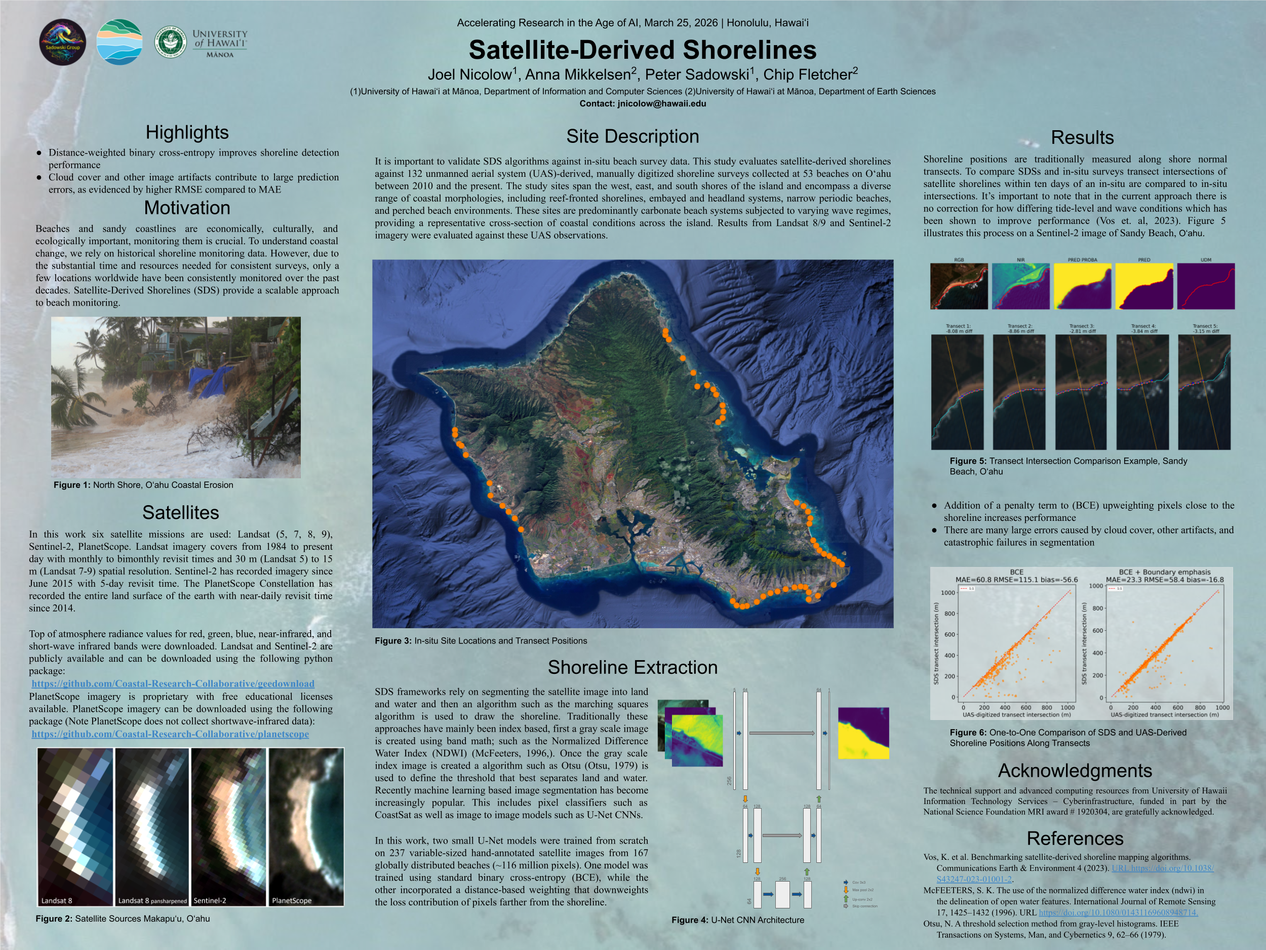 I had the opportunity to present my poster titled “Satellite-Derived Shorelines” at the 2026 Accelerating Research in the Age of AI: A Synergistic Workshop with Google on March 25th at the Sullivan Conference Center. It was a great experience attending inspiring talks!